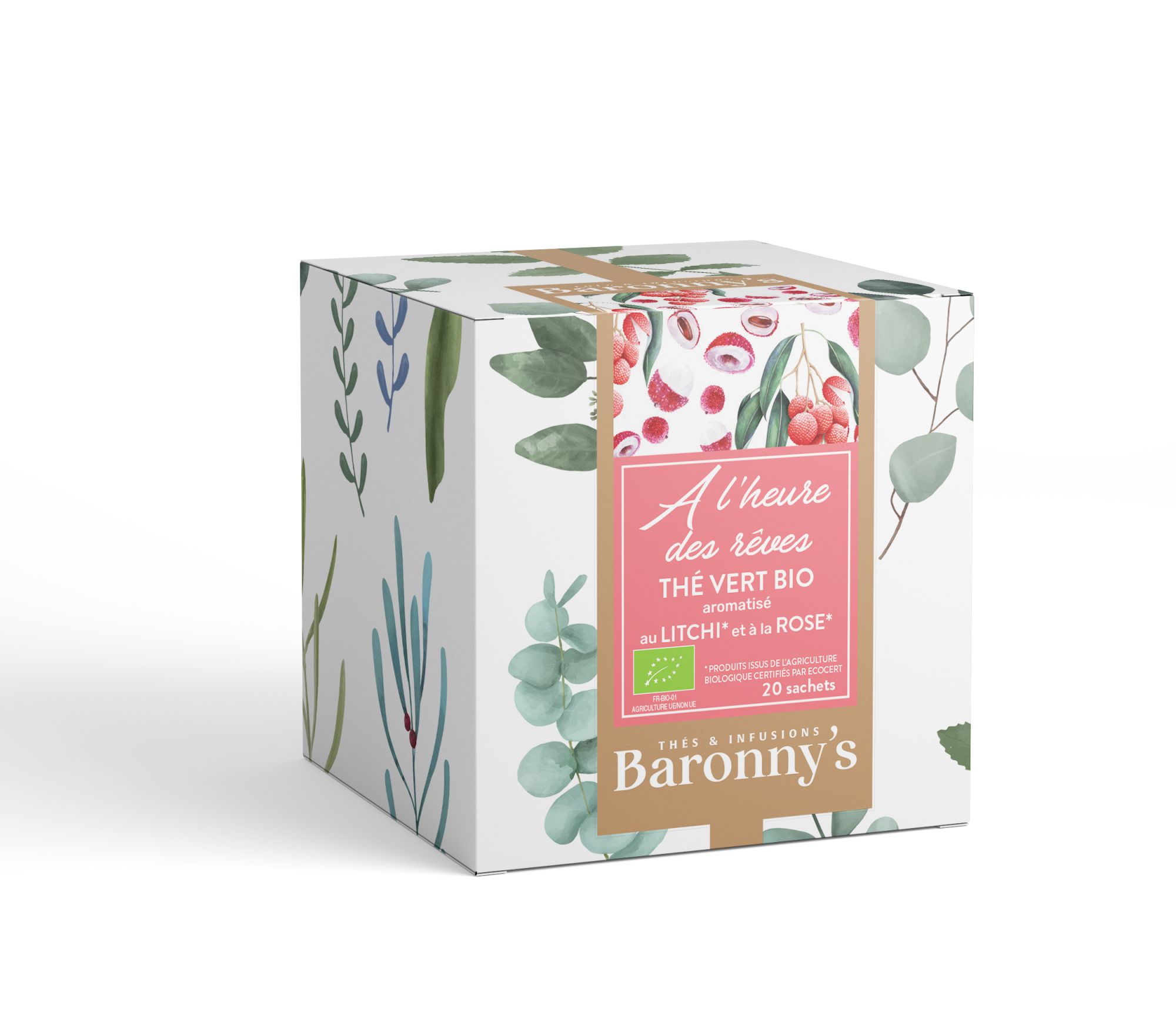 Thé vert*, feuilles de moringa*, arôme naturel de fleur de fruit (litchi-rose), curcuma*, feuilles de mélisse*, pétales de soucis*, pétales de bleuets*, pétales de rose*, *Produits issus de l'Agriculture Biologique, certifiés ECOCERT FR-BIO-01