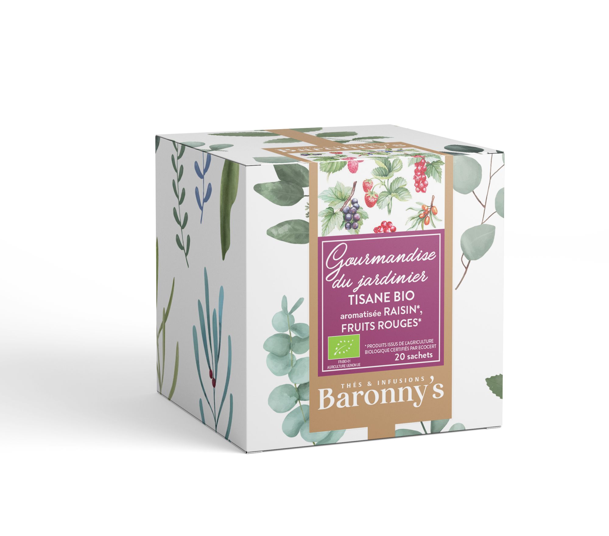 Raisins*, pétales d'hibiscus*, arôme naturel de fruit, baies de sureau*, groseilles*, morceaux de fraises*, pétales de tournesol*, *Produits issus de l'Agriculture Biologique, certifiés ECOCERT FR-BIO-01